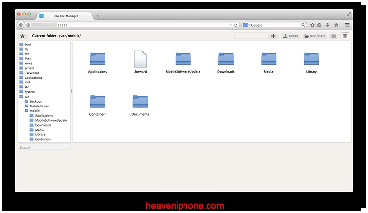 Từ đây, bạn có thể điều hướng file hệ thống thiết bị iOS của bạn trên máy tính , tải lên các tập tin mới, tạo thư mục mới, tìm kiếm các tập tin, và nhiều hơn nữa. Bạn sẽ cảm thấy như đang được ở Filza trên thiết bị iOS của bạn . Điều này làm cho nó siêu đơn giản để tải lên tập tin mới vào thiết bị của bạn mà không cần phải SSH hoặc sử dụng kết nối USB. Thay vào đó, nó sử dụng một kết nối Wi-Fi đơn giản.