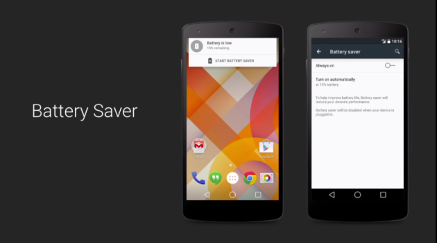Project Volta trên Android L được hứa hẹn sẽ giải quyết những mối lo ngại về tình trạng ngốn pin. Bắt đầu từ phiên bản này, tính năng tiết kiệm pin sẽ được Android tích hợp sẵn vào Android. Nó có thể điều chỉnh hiệu năng của thiết bị phù hợp với từng điều kiện sử dụng khác nhau, ngoài việc giảm độ sáng nó còn có thể ngắt bớt các hiệu ứng xử lý của CPU, GPU hay nhiều thứ khác... tùy thuộc từng ứng dụng.