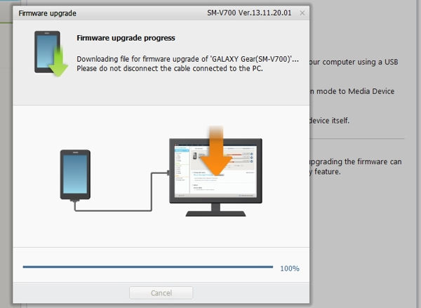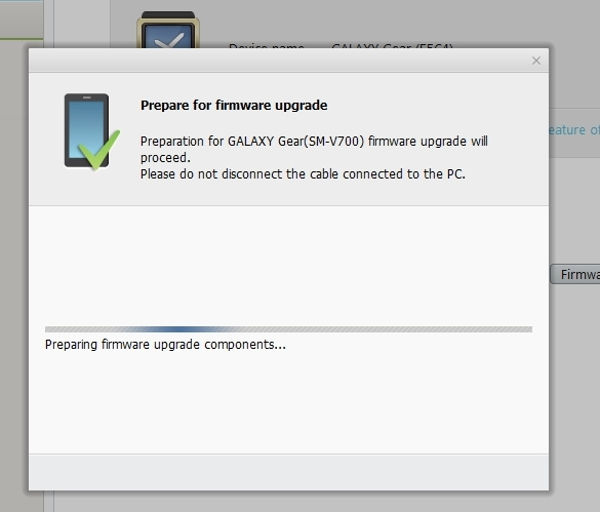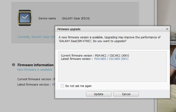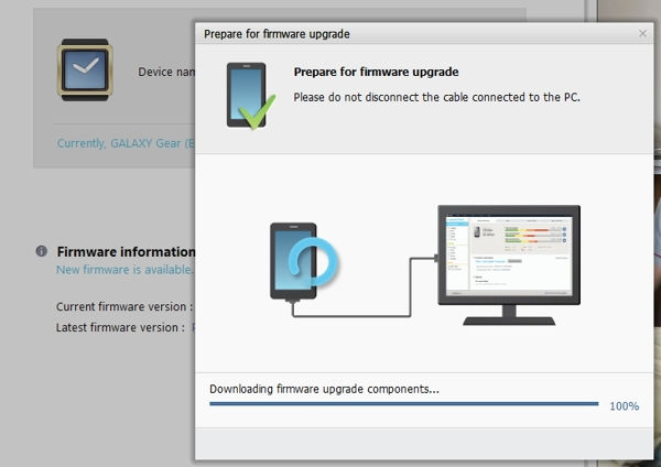 Tiến hành update Firmware: Chạy Kies trên PC/Laptop, cho Gear 1 vào dock sạc và cắm cáp kết nối Gear vào PC.