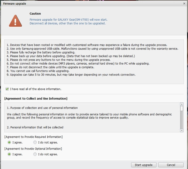 Kies sẽ tìm cách kết nối với Gear và ngay sau đó sẽ xuất hiện thông báo về bản cập nhật mới. Kies sẽ hỏi bạn có muốn cập nhật không ... hãy thực hiện tuần tự như các hình minh họa dưới đây.