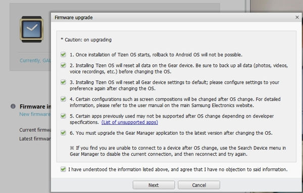 Bản cập nhật Tizen OS sẽ không cung cấp qua phương thức OTA (Over-The-Air), điều này có nghĩa bạn sẽ cần một máy tính và chuyển sang Tizen bằng tiện ích Samsung Kies. Một điều bạn cần nhớ, bạn sẽ mất tất cả mọi thứ hiện có trên thiết bị của mình, do đó bạn cần backup dữ liệu trước khi thực hiện.