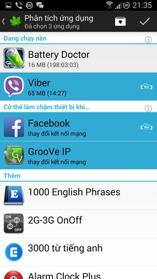 Sau một thời gian dài thử nghiệm với hầu hết các phần mềm dạng này, tôi giới thiệu với các bạn tiện ích BATTERY DOCTOR, một phần mềm hổ trợ tuyệt vời cho việc tự động hóa một số tiến trình thường dùng để kéo dài thời gian sử dụng pin trên thiết bị. Các tính năng nổi bật của phần mềm này là: Tự động đóng các ứng dụng chạy ngầm có luôn tính năng loại trừ danh sách trắng (Auto Kill Managerment and White List), Tiết kiệm thông minh - Smart Saving (bao gồm: quản lý ứng dụng tự chạy khi khởi động thiết bị (Autostart Managerment), Quản lý xung nhịp của bộ vi xử lý (CPU Managerment), Thiết lập định sẳn - Mode (quản lý độ sáng màn hình, âm lượng, kết nối 3G/Wifi ...) và các thiết lập này có thể tự động chuyển đổi theo lịch trình (Mode / Schedule) ...