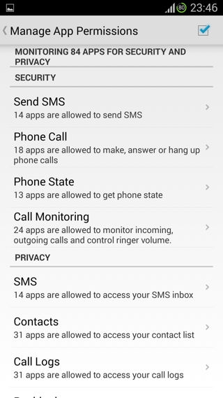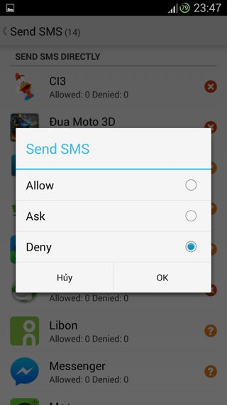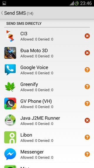Việc sử dụng tiện ích này khá là đơn giản: hãy chạy tiện ích, chọn Manage App Permission, sẽ xuất hiện danh sách các phần mềm trên thiết bị có các quyền tương ứng. Chọn một dòng tương ứng với tính năng mà bạn cần quản lý (ví dụ Send SMS). Danh sách hiển thị các phần mềm có chức năng này sẽ xuất hiện. Hãy chọn một phần mềm mà bạn muốn quản lý và chọn mục Deny hoặc Ask để ngăn chặn hoặc buộc ứng dụng phải đưa ra tùy chọn cho người dùng quyết định khi phần mềm này muốn tự động gởi tin nhắn SMS.