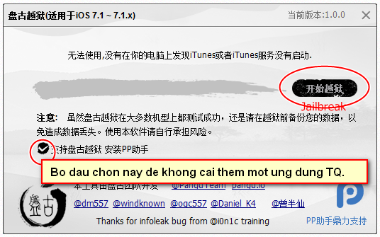 2014-07-26 09:30Hôm nay công cụ jailbreak untether cho hệ điều hành iOS 7.1 và 7.1.1 bất ngờ được tung ra với tênPangu. Ứng dụng do một team gồm các thành viên Daniel_K4, dm557, windknown, và OGC557 thực hiện. Hiện tại ứng dụng đã hỗ trợ ngôn ngữ Tiếng Anh & phát hành trên Windows lẫn Mac & bạn có thể yên tâm vì iH8Sn0w đã xác nhận là ứng dụng không chứa spyware. Tuy nhiên, khi cài đặt ứng dụng sẽ cài đặt thêm một ứng dụng khác ngoài Cydia vào thiết bị (Có thể bỏ chọn để không cài ứng dụng này, mời bạn coi hướng dẫn ở dưới).