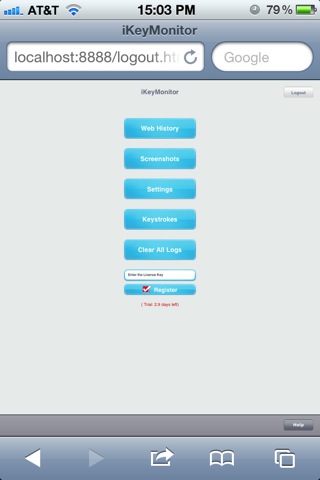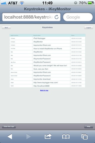 iKeyMonitor là một Keylogger iOS cho iPhone / iPad / iPod Touch. Nó lưu lại các bản ghi tổ hợp phím, các trang web, ảnh chụp màn hình và tự động gửi các bản ghi cho bạn qua email hoặc FTP.