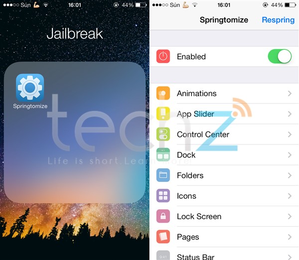 Ứng dụng Jailbreak được đánh giá rất cao trên cộng đồng Cydia. Springtomize có khả năng tinh chỉnh cực kỳ mạnh mẽ, bạn có thể điều chỉnh tốc độ hiệu ứng trên thiết bị với Animations, loại bỏ các mục không cần thiết của thanh Control Center. Làm trong suốt, bổ sung các ứng dụng vào thanh dock, tinh chỉnh kích thước các icon, màn hình khoá, thanh trạng thái và rất nhiều những mục chuyên sâu khác. Springtomize 3 hiện có giá 2.99USD trên Source BigBoss, nếu muốn tải miễn phí ứng dụng này, bạn có thể bổ sung thêm source Cydia.vn.