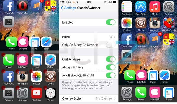 ClassicSwitcher sẽ biến đổi trình đa nhiệm trên iOS 6 sang iOS 7. Cách thức hoạt động trình đa nhiệm trên ClassicSwitcher hoàn toàn giống iOS 6, tức bạn sẽ không phải xoá từng ứng dụng theo kiểu vuốt lên trên iOS 7, thay vào đó bạn chỉ việc chạm nhẹ vào dấu (-) để xoá. Không những thế, ClassicSwitcher cho phép bạn thoát hết ứng dụng đang chạy, rất hữu ích.