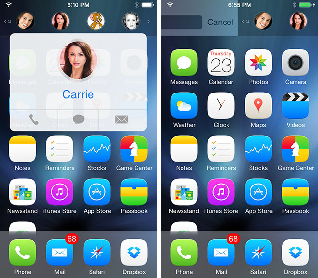 Thay vì trước đây bạn vuốt xuống để hiện ra thanh tìm kiếm Spotlight, nay ứng dụng QuickContacts đã được tích hợp và hỗ trợ hiển thị những danh bạ yêu thích. Bạn có thể truy cập để gởi tin nhắn, gọi điện, gởi mail nhanh chóng. Ngoài ra, bạn có thể trượt sang phải để sử dụng trở lại thanh tìm kiếm Spotlight.